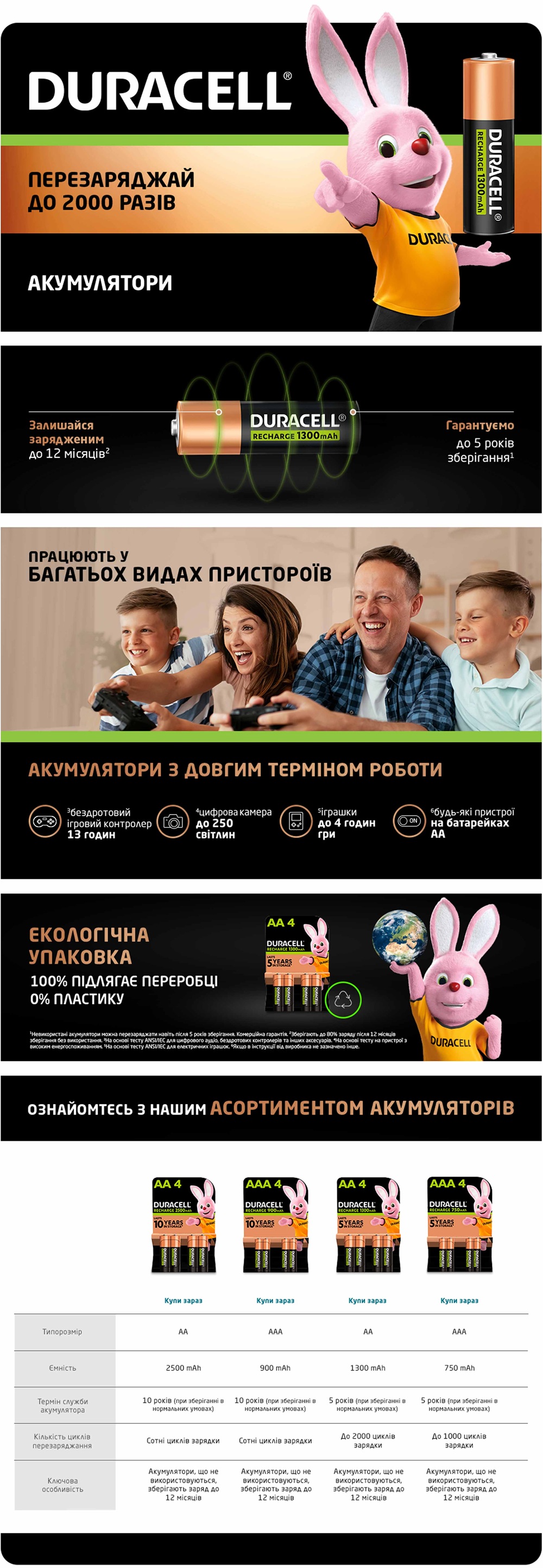 Їх можна перезаряджати до 2000 разів і вони будуть зберігати заряд до 12 місяців, якщо не використовуються*.