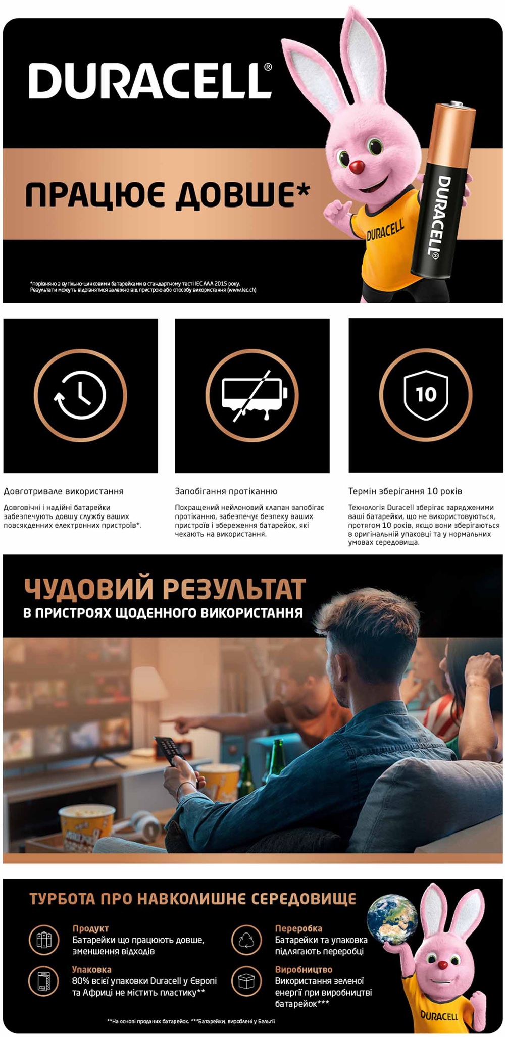 Результати можуть відрізнятися залежно від пристрою або способу використання (www.iec.ch)) і доступні в розмірах AA, AAA, C, D і 9V. Технологія Duralock зберігає батарейки Duracell, які не використовувались, готовими до використання і зарядженими до 10 років при зберіганні в нормальних умовах.