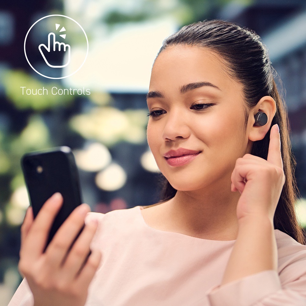 Завдяки сенсорним датчикам на обох навушниках B120W, ви можете швидко перемикатися між музикою та дзвінками, а також викликати голосового асистента, пропускати треки та регулювати гучність.