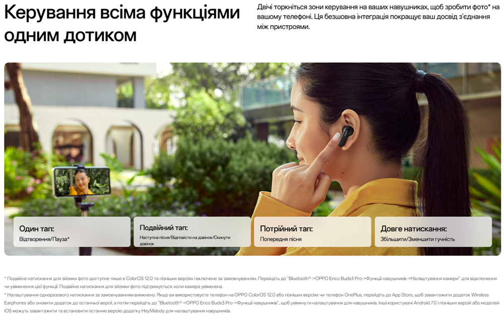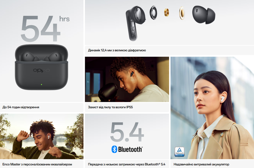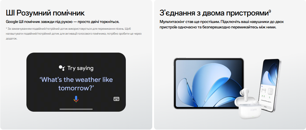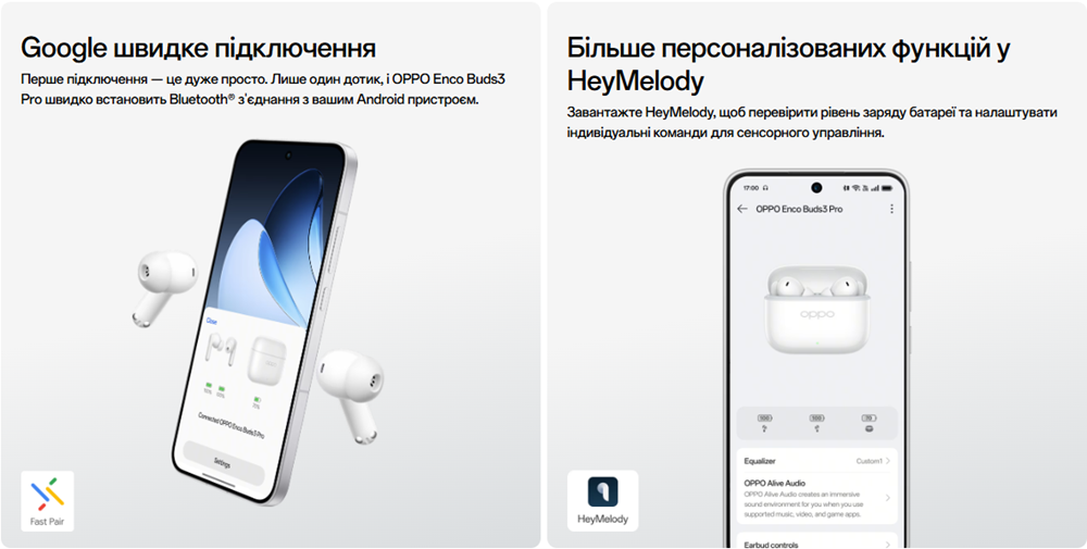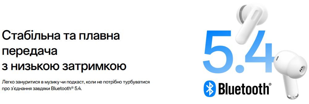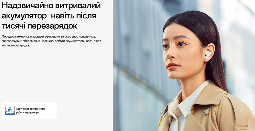 - Додаткові можливості Сенсорне керування; Google Fast Pair; Сертифікат TÜV Rheinland (час циклу життя акумулятора досягає 1000 зарядів-розрядів); Подвійне підключення одночасно до двох пристроїв; AI (асистент штучний інтелект); Эквалайзер Enco Master