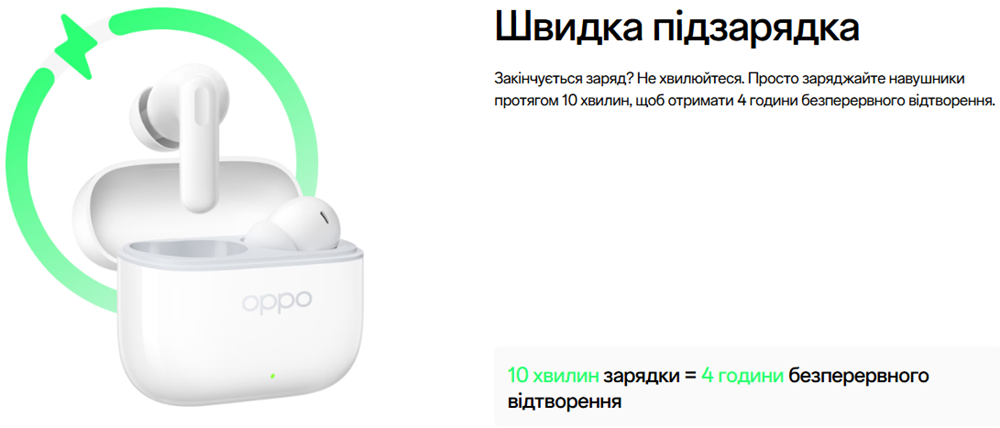 - Час зарядки Час зарядки (швидка зарядка): 10 хвилин для 4 годин (одне заряджання) / 8 годин (із зарядним кейсом) /