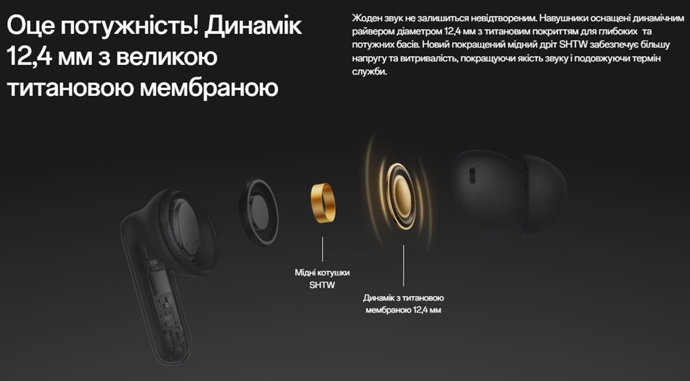 - Вага Кожен навушник: 4.3 г; Зарядний кейс: 42.7 г