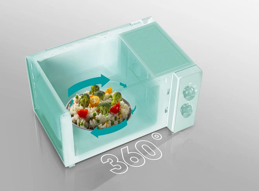 Їжа готується, розігрівається або підсмажується на грилі до ідеального стану, оскільки тепло сягає кожної часточки. Завдяки постійному обертанню тарілки хвилі проникають у страву з усіх боків, що забезпечує ефективність і рівномірність приготування їжі. Обертання також сприяє оптимальному розморожуванню. Тарілка легко знімається для зручності чищення та підходить для миття в посудомийній машині.