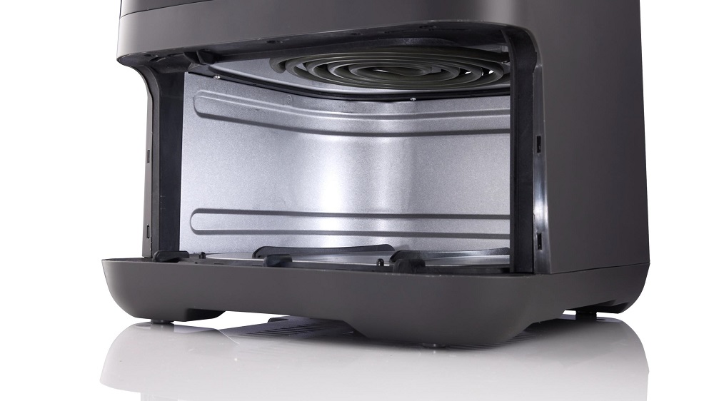 Камера зроблена з високоякісного металу, що запобігає появі неприємного запаху пластику. Він безпечний і довговічний. Світло, нагрівач і вентилятор розміщені зверху та забезпечують ідеальне розподілення тепла. Завдяки металевій поверхні внутрішню частину легко чистити, і якщо це робити регулярно, єдиним запахом, що виходить з аерофритюрниці, буде аромат апетитних страв.