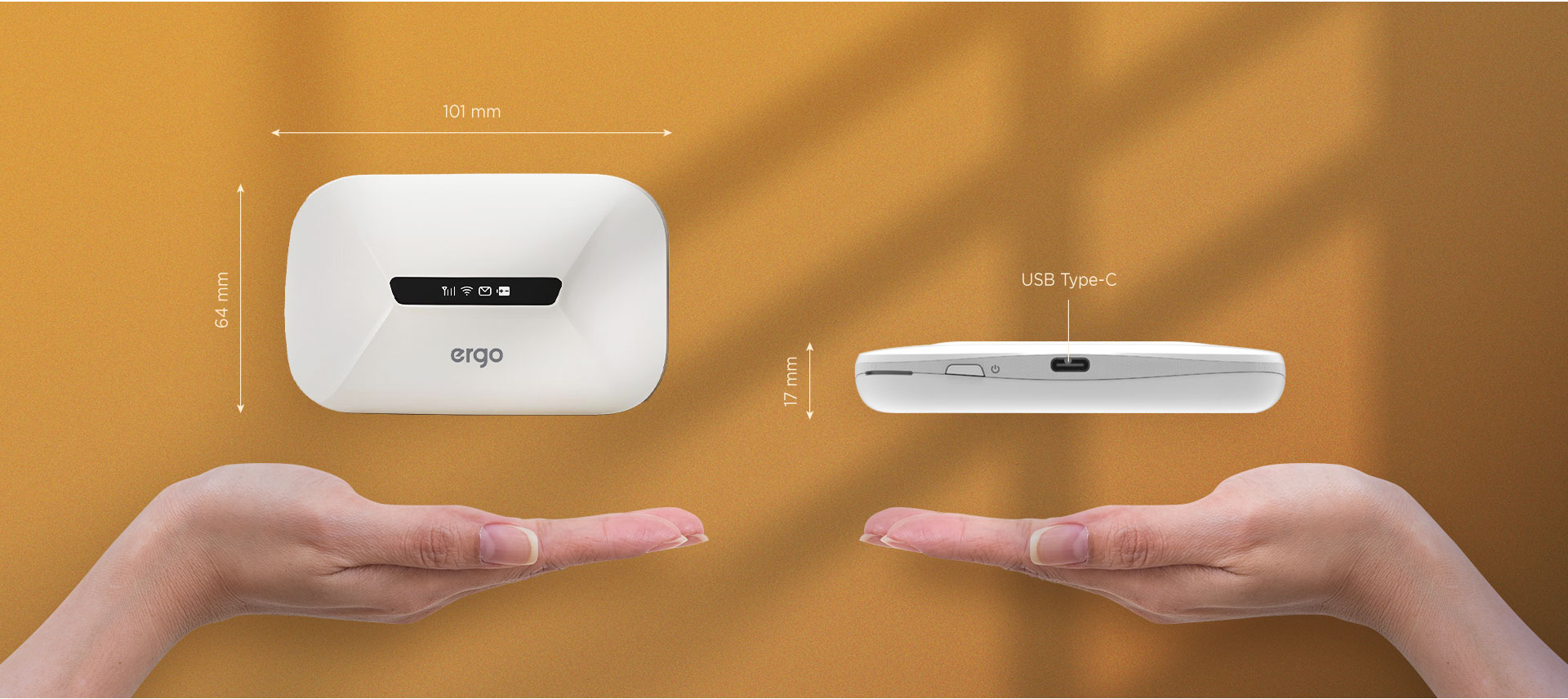Роутер ERGO M126 має компактний корпус, тож його можна зручно переносити навіть у кишені. Даний пристрій з легкістю налаштовується через веб-інтерфейс, приєднується до комп’ютера за допомогою як Wi-Fi, так і з’єднання через USB-порт Type-C, має світлодіодну індикацію та максимально автономний режим роботи.