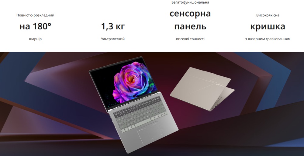 Легкий, тонкий і мобільний Swift Go 14 має обтічну, вигравірувану лазером кришку, що відкривається на 180° і вишукано виглядає будь-де. Сенсорна панель з кількома елементами керування легко працює з мультимедійними файлами та відеодзвінками.