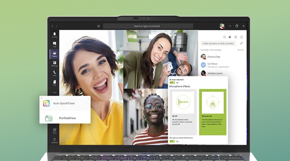 Завдяки 3-му мікрофону та технології шумозаглушення зі штучним інтелектом Acer PurifiedVoice™ 2.0 усуваються небажані фонові шуми, забезпечуючи виняткову чистоту та чіткість звучання голосу.
