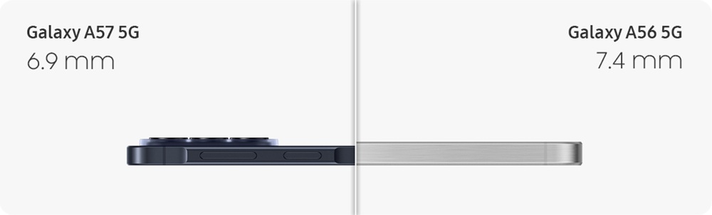 Зустрічайте новий Galaxy A57 5G – з оновленим дизайном на передній і задній панелях, створеним привертати погляди. Тонший, ніж будь-коли, Galaxy A57 5G отримав витончений силует і глянцеве покриття, що виглядає елегантно й сучасно. Смартфон став також легший за попередню модель, тому його зручно тримати навіть однією рукою. Потрійна камера на задній панелі розміщена на виступі, що створює ефект напівпрозорого скла. Такий стильний дизайн не залишиться непоміченим.