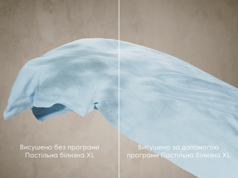 Програма Постільна білизна XL забезпечує рівномірні результати сушіння для XL-завантажень, включно з комплектами постільної білизни, без потреби перезапускати сушильну машину.